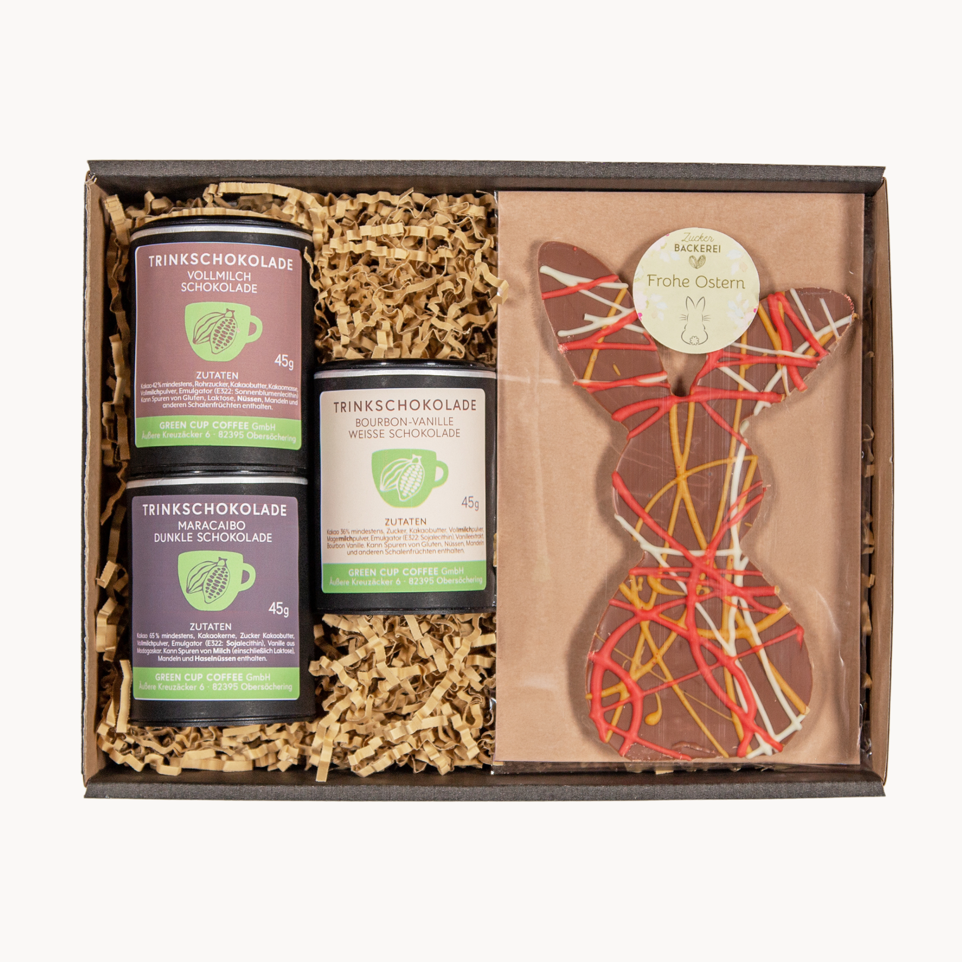Schokolade pur – zum Probieren und Genießen! Drei Sorten feinste Trinkschokolade laden zu einer köstlichen Entdeckungsreise ein. Abgerundet wird das Set durch einen handgefertigten Schoko-Osterhasen aus cremiger Vollmilchschokolade. Hübsch verpackt in einer Geschenkbox – ein süßes Präsent, das garantiert für leuchtende Augen sorgt!