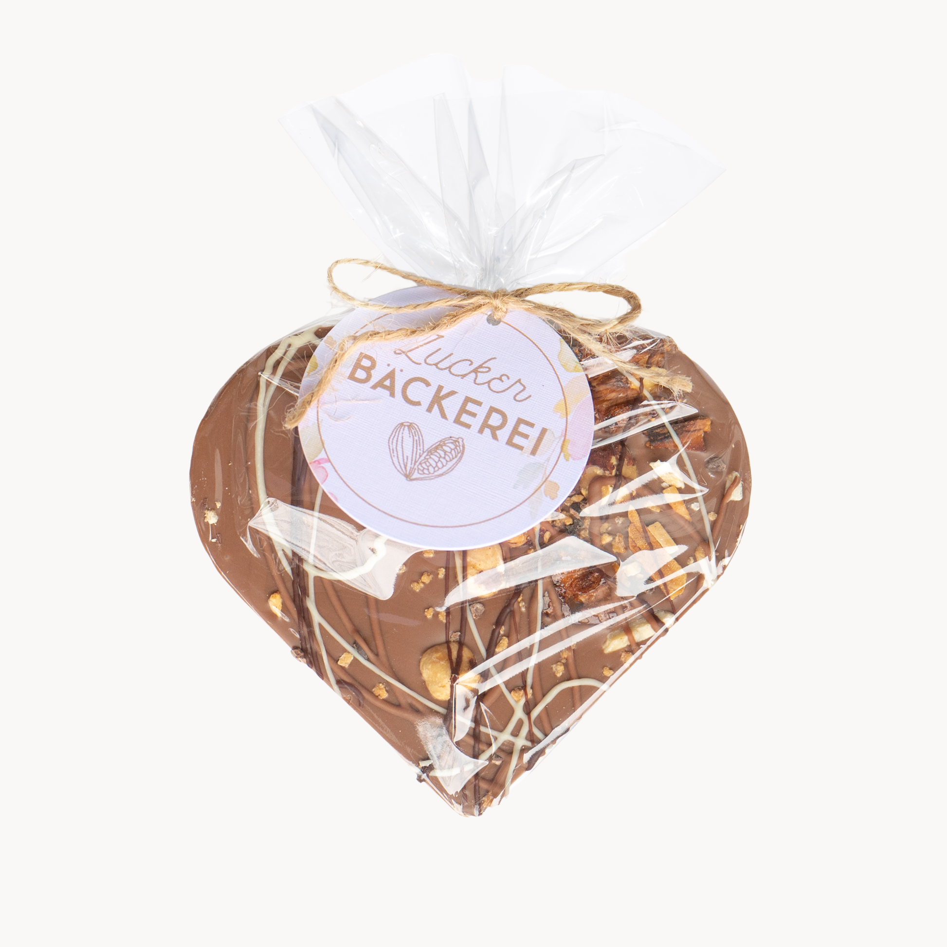 Schoko-Herz aus Vollmilchschokolade mit verschiedenen Nüssen und dunkler Schokolade getoppt