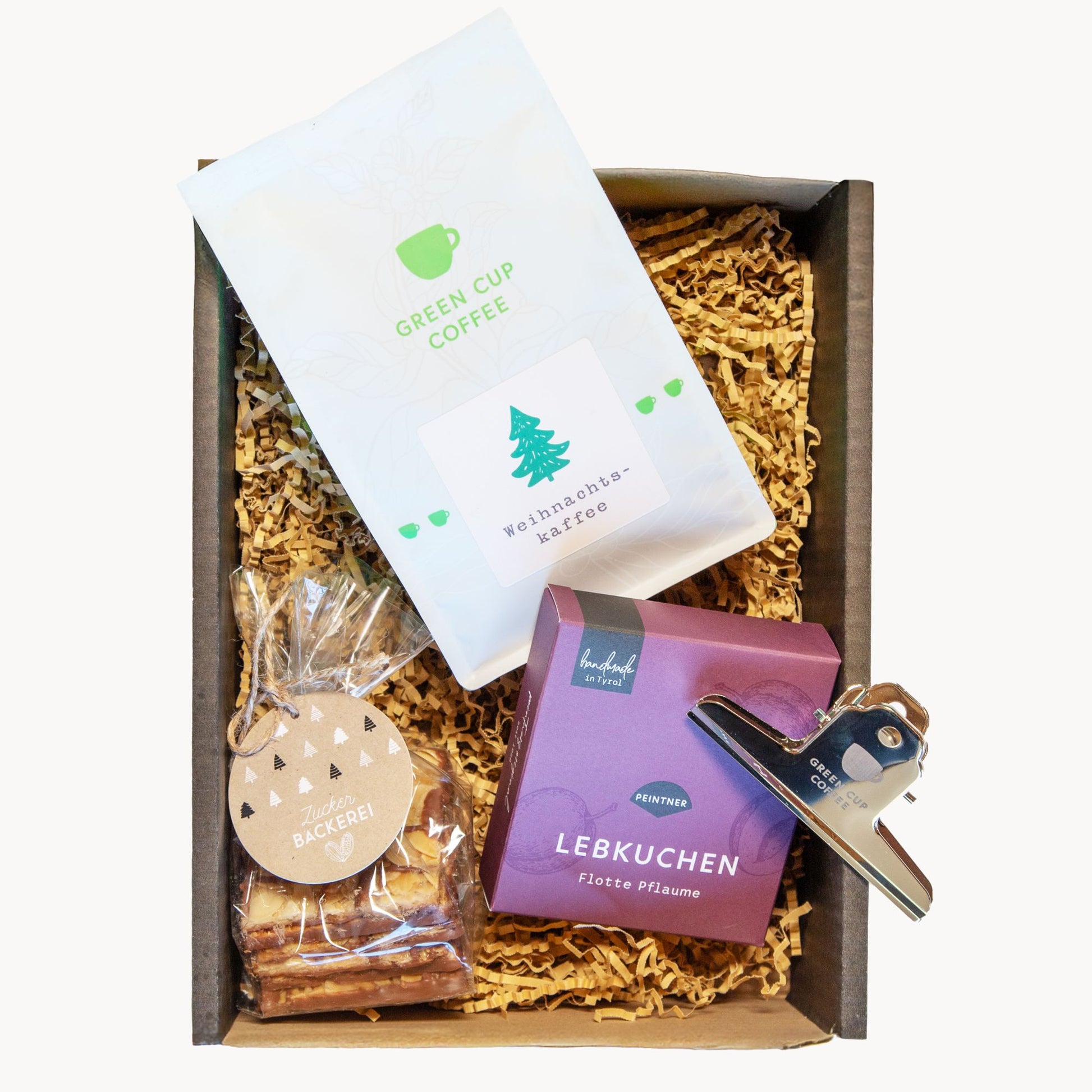 Darf es für Deine Liebsten etwas mehr sein? Unsere stimmige Geschenkbox enthält 1 x Weihnachtskaffee, zarte Mandelplättchen und einen himmlischen Lebkuchen.
